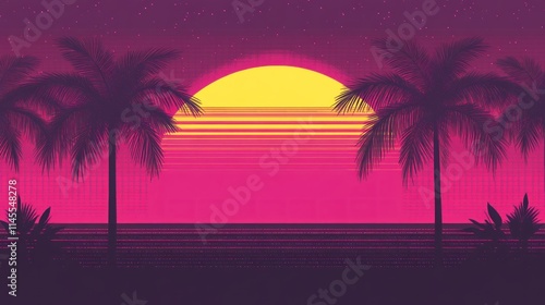 © Alfath, Naklejka premium Retro sunset landscape with palm trees.