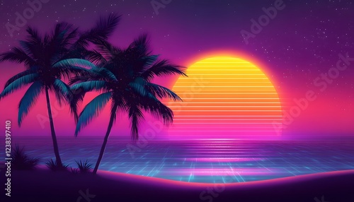 © Berkah, Naklejka premium Retro Sunset Palm Trees Beach Scene