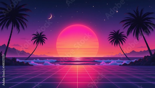 © DexaStd, Fototapeta premium Retro Sunset Paradise: Palm Trees, Ocean Waves, and a Synthwave Vibe