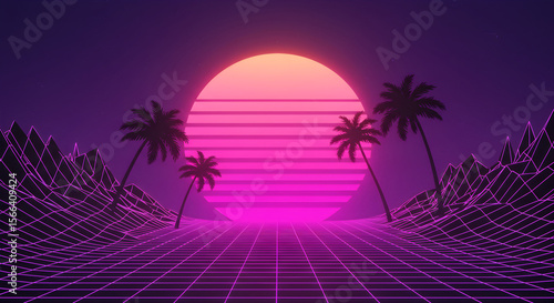 © yanto, Fototapeta premium Retro Synthwave Landscape with Palm Trees and Wireframe Terrain