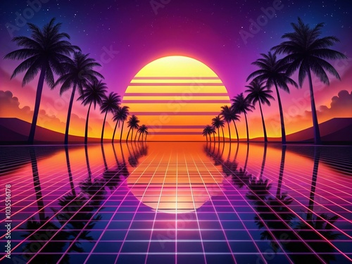 © Four888, Fototapeta premium Retro Synthwave Landscape with Palms and Sunset for Futuristic Vibes