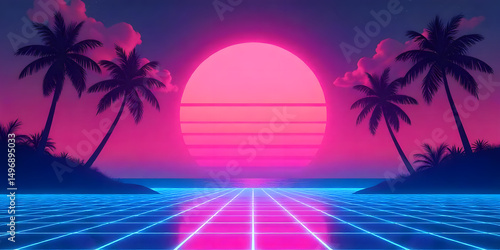 © Dahlia, Fototapeta premium Retro synthwave sunset tropical island paradise
