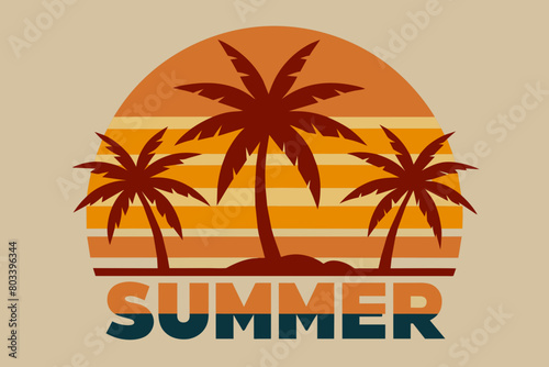 © Chayon Sarker, Naklejka premium Retro vintage style sunset, text "Summer " 3 palm tree, sea beach, sunset, Adobe Illustrator illustration, 16k, T-shirt design, T-shirt graphic, retro vintage style half circle., illustration, white