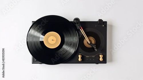 © adi, Obraz premium Retro vinyl player, lp records, headphones on background. Top view. Retro style. Flat lay