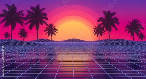 Naklejka premium Retro wave aesthetic featuring palm trees and a grid landscape at sunset with...