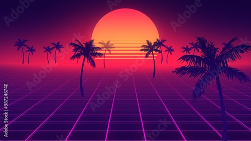 © SquareMotion, Naklejka premium Retro wave horizon landscape illustration. Bright glowing neon lights. Synthwave wireframe net. Palm trees on front. Sunset on beach. 80s, 90s style. Retro Futurism Background. 3D Render. Perspective