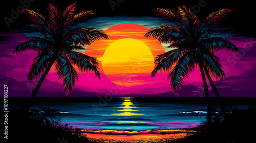 © Thiago, Naklejka premium Retro wave horizon landscape with neon lights, palm trees, and sunset at the beach, retro futurism, synthwave. Neon Vaporwave Sunset. Illustration
