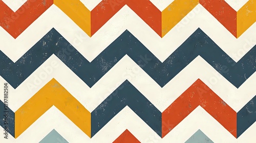 © Yuliia, Obraz premium Retro zigzag pattern in navy blue, orange, and yellow with distressed texture creates dynamic geometric design. Seamless repeat for fabric and wallpaper applications.