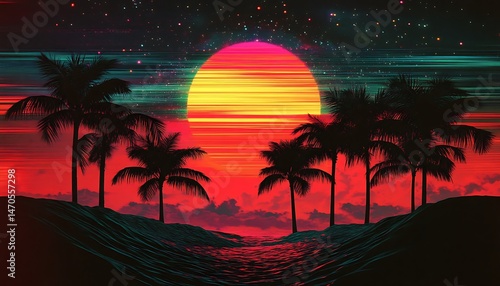 © Shahida, Naklejka premium Retrowave Ocean View with Palm Trees, Red Sunset and Glowing Stars Synthwave Style