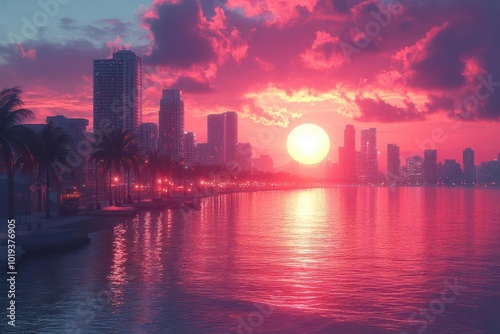 Fototapeta premium retrowave sunset over a cyberpunk cityscape holographic palm trees lining a neonlit beach promenade