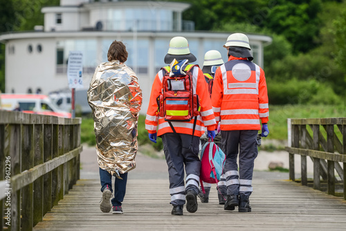 © benjaminnolte, Fototapeta premium Rettungskräfte begleiten verletzte Person