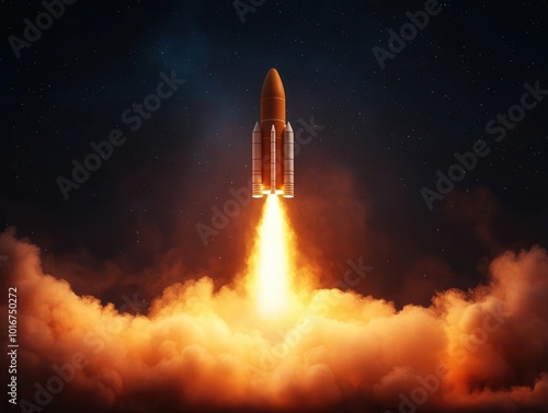 © Green Creator, Obraz premium Reusable rocket booster landing back on a platform, fiery descent, Aerospace Engineering, space sustainability