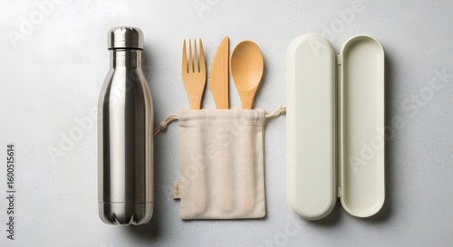 Fototapeta premium Reusable stainless steel water bottle and bamboo cutlery set for sustainable living.