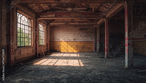 Obraz premium Revealing industrial hall in warehouse exposing cracked floor rusted arched windows, with columns