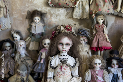 © Sirisook, Fototapeta premium Revel in the harmonious blend of innocence and darkness portrayed through dolls