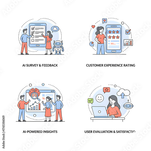 © Zengoku, Naklejka premium Review set. Characters use artificial intelligence to fill survey form, give feedback, customer evaluation rating. User experience concept. illustration design.