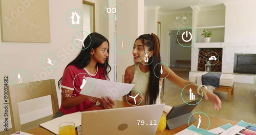Fototapeta premium Reviewing charts, pair in red tee, green top using laptop, tablet, AR overlays at home
