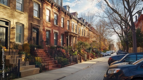 Fototapeta premium Revitalized urban district with a series of row houses, emphasizing modern design and the resurgence of city living.