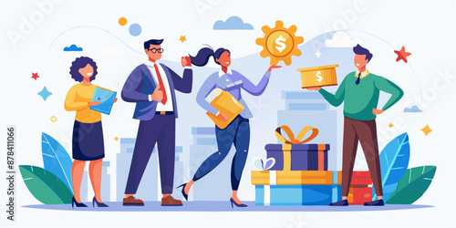 © Vector, Fototapeta premium Rewarding Excellence: Boss Hands Bonus Cash with Ribbon to High-Performing Employee, Recognizing Exceptional Work