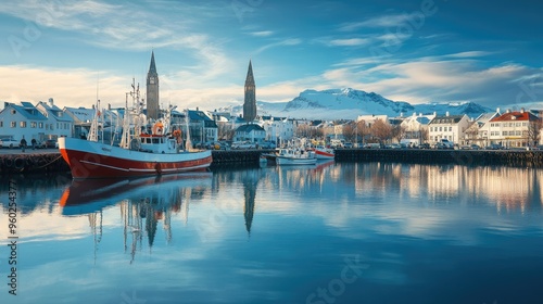 © Theeranan, Naklejka premium Reykjavik's harbor with fishermen working and boats coming in, with the city skyline behind.