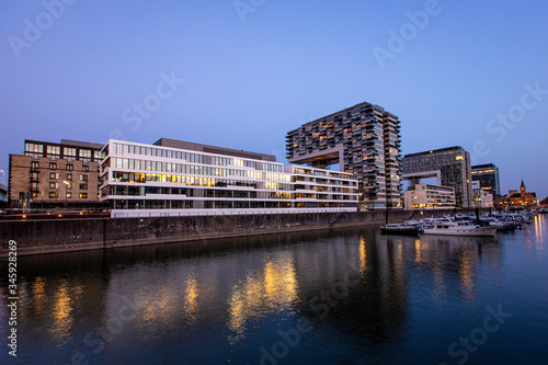 © FlagMan, Naklejka premium Rheinauhafen in Köln mit Kranhäusern romantisch am Abend