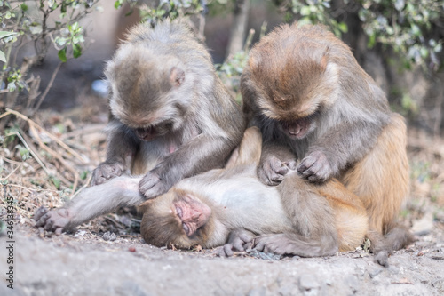 Naklejka premium Rhesus macaque family at Monkey temple (Swoyambhu Temple) in Kathmandu, Nepal