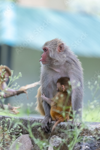 Naklejka premium Rhesus macaque (Macaca mulatta) or Indian Monkey in forest with cub.