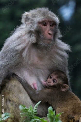 Naklejka premium Rhesus macaque sitting calmly and nursing her baby