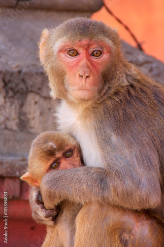 Naklejka premium Rhesus macaque with a baby sitting on a wall in Jaipur, Rajastha