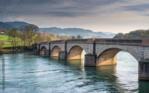 Fototapeta premium Rhine River Germany ,Europe Stone Arch Bridge over River, Cloudy Landscape