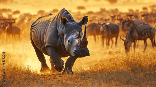 © Nas, Obraz premium Rhino Charging Through Savanna at Sunset