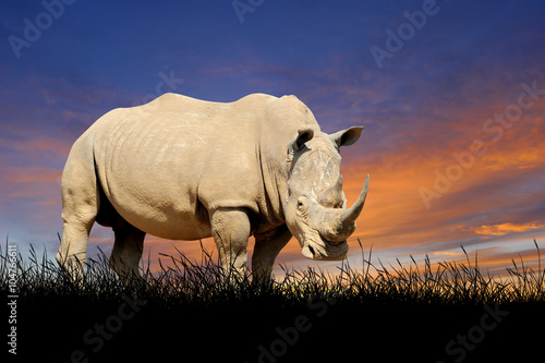 © byrdyak, Fototapeta premium Rhino on the background of sunset sky