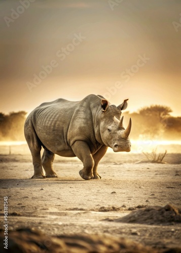 © OlgaNeuroArt, Fototapeta premium Rhino Walking Through Desert at Sunset, Wildlife Conservation Photography