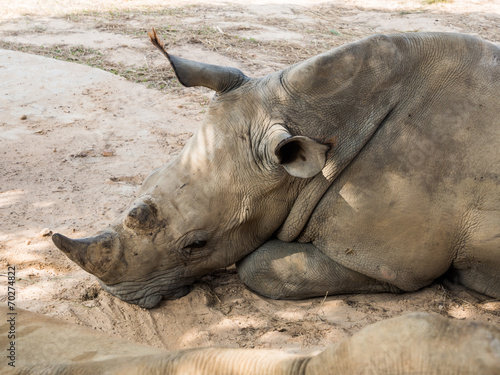 Obraz premium Rhinoceros lay down under tree shade