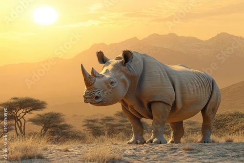 © Azmil, Obraz premium Rhinoceros Standing in African Savannah at Sunset