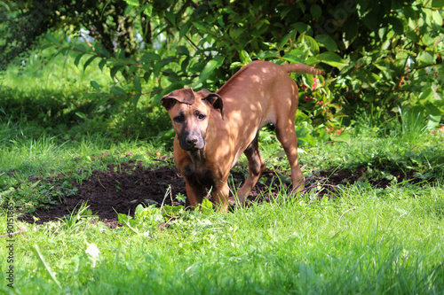 © Sandra Hanslicek, Fototapeta premium Rhodesian Ridgeback Junghund buddelt Loch 2