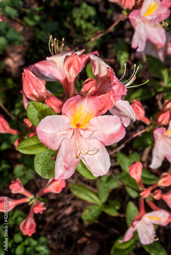 Fototapeta premium Rhododendron 'Satomi' (Rhododendron x mollis) in garden, Moscow region, Russia