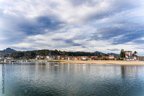 Naklejka premium Ribadesella cityscape reflecting on the calm water of the sella river in...