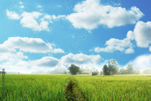© Alex395, Obraz premium Rice field and blue sky landscape nature background