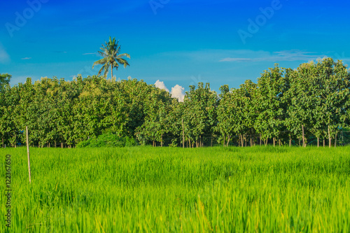© lamyai, Fototapeta premium rice field and Forest Park on the day of blue sky