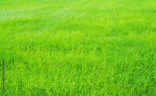 © wing-wing, Obraz premium Rice field background, jasmine rice organic agriculture farm raw food ingredient traditional asian, green grass landscape environment zero carbon energy eco concept.