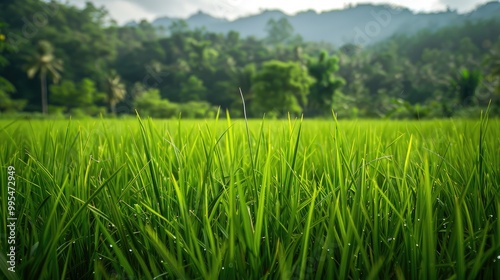 © ArtificialHorizons, Obraz premium Rice field covered in green