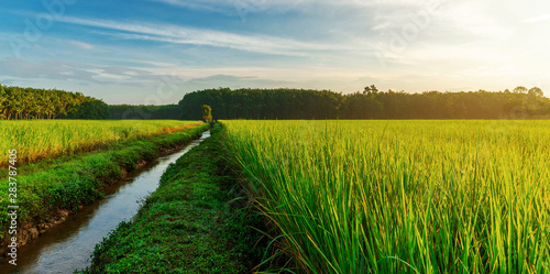 Obraz premium Rice field panorama with sunrise or sunset in moning light