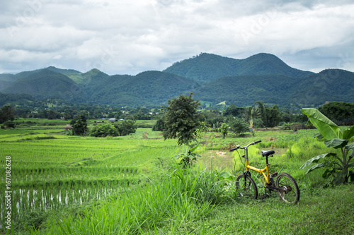 Fototapeta premium Rice field tourism ride bicycle at pai city