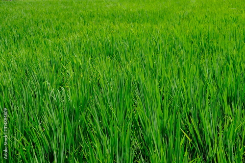 © KrutSolt, Fototapeta premium Rice field with a smooth green cover.