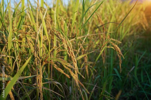 © somchai, Obraz premium Rice field with seed panicles