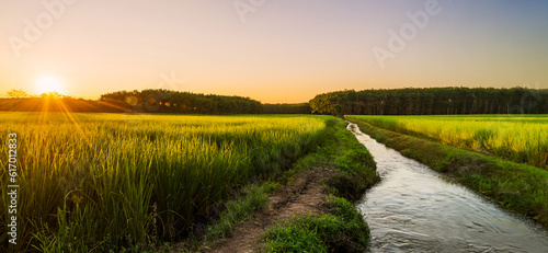 Fototapeta premium Rice field with sunrise or sunset in moning light