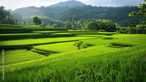 Fototapeta premium Rice fields in various stages of growth, showcasing a spectrum of green shades