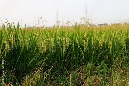 © Naron Purba, Fototapeta premium Rice fields or paddy field prepare the harvest. Close up of yellow green rice field