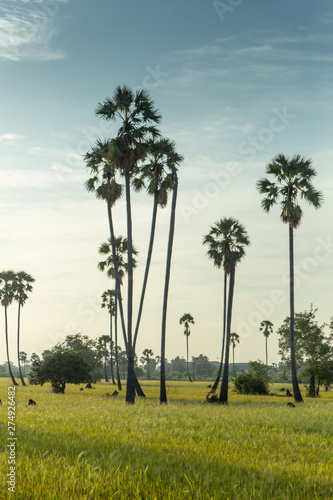 © Sek, Fototapeta premium Rice fields with palm sugar palm trees and sun light at Pathum Thani, Thailand